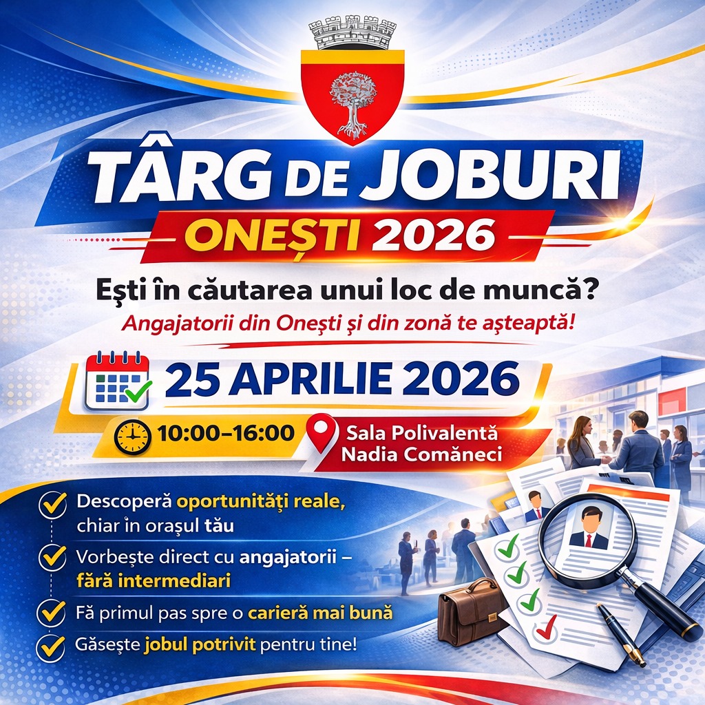 Primăria Municipiului Onești, în parteneriat cu Agenția Județeană pentru Ocuparea Forței de Muncă Bacău, organizează Târgul de Joburi, un eveniment dedicat întâlnirii directe dintre angajatori și persoanele aflate în căutarea unui loc de muncă.